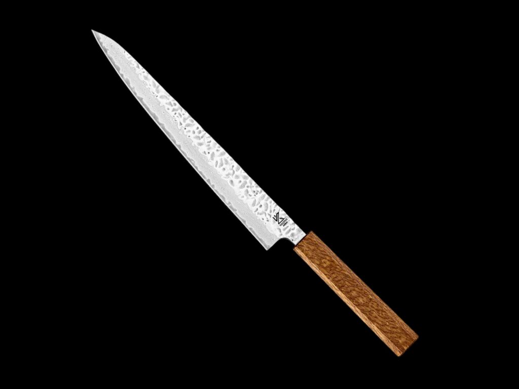 The sujihiki is Japan’s slicing knife: long, narrow and double-bevelled. Unlike the yanagiba (which is purpose-built for raw fish), the sujihiki excels at carving roast meat, slicing smoked salmon or breaking down any boneless protein where clean, even cuts matter. Its narrow profile reduces drag and friction, allowing the blade to glide through flesh without tearing. Think of it as a more refined, harder-edged alternative to a Western carving knife.