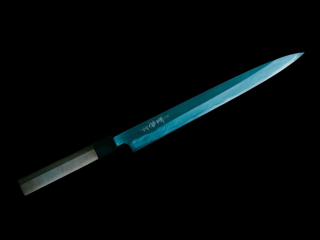 This is where Japanese knife design truly diverges from Western tradition. The yanagiba (sometimes called shobu, meaning ‘iris leaf’) is the archetypal sashimi knife: long, slender and single-bevelled. Its purpose is to slice boneless fish fillets in one fluid drawing motion from heel to tip. This single-stroke technique minimises cellular damage, which is why sashimi sliced with a yanagiba tastes fresher and has better texture than fish hacked with an inappropriate blade.