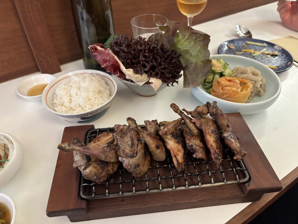 The BBQ quail was the main event on our visit, and arrived as several birds portioned on a rack, burnished from the coals, their skin blistered and salty. Alongside comes the full banchan spread – rice, lettuce cups for wrapping, house kimchi and pickles – turning lunch into something participatory and gloriously hands-on. It’s the kind of dish that demands you put your phone down and get stuck in.