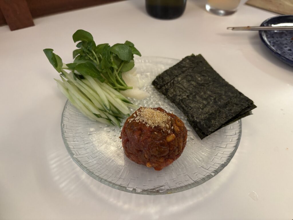 From the raw section, Jinju style beef is a standout. Reminding us of a rubber band ball in appearance only, it’s spun through with house gochujang to give the tangle of flesh some life and dignity. Served alongside are sheets of nori and julienned Korean pear for DIY assembly. The interplay of rich, spiced beef against the crisp sweetness of the fruit is inspired. Everything is served at just the right temperature: the beef and pear ice cold by design, not accident.