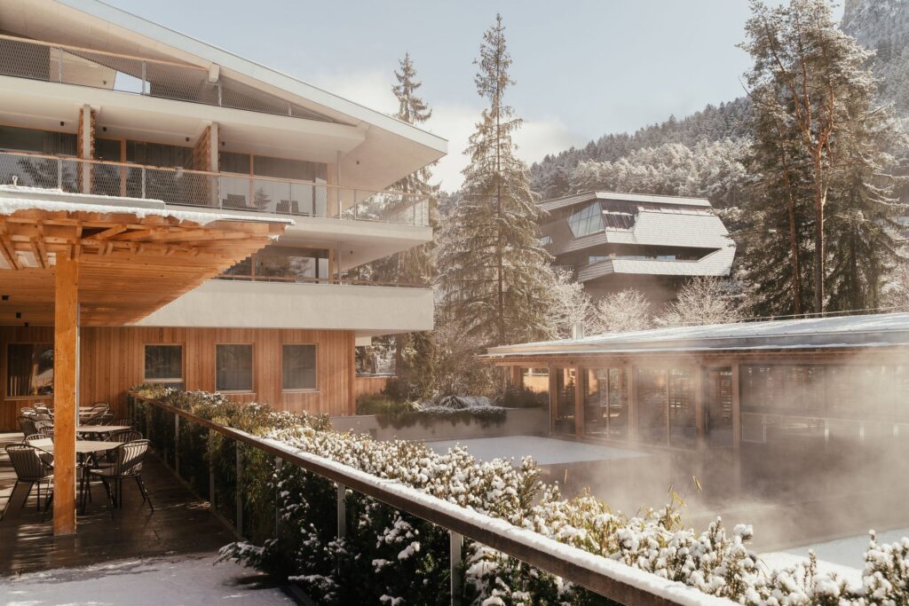 In 1912, doctors commissioned by the Austro-Hungarian monarchy selected a clearing on the southern slope of the Plose mountain, above the city of Brixen, as an ideal site for a pulmonary sanatorium. The First World War intervened before the building was completed. The structure sat abandoned until 2000, when hotelier Alois Hinteregger discovered it – drawn by the quality of light falling across the clearing and the unobstructed views to the Dolomites. The hotel opened in 2009, was rebuilt from the ground up in 2020, and today operates as a five-star adults-only inspired by the same natural features that were once decisive in establishing a sanatorium – excellent water, air, sun and climate.