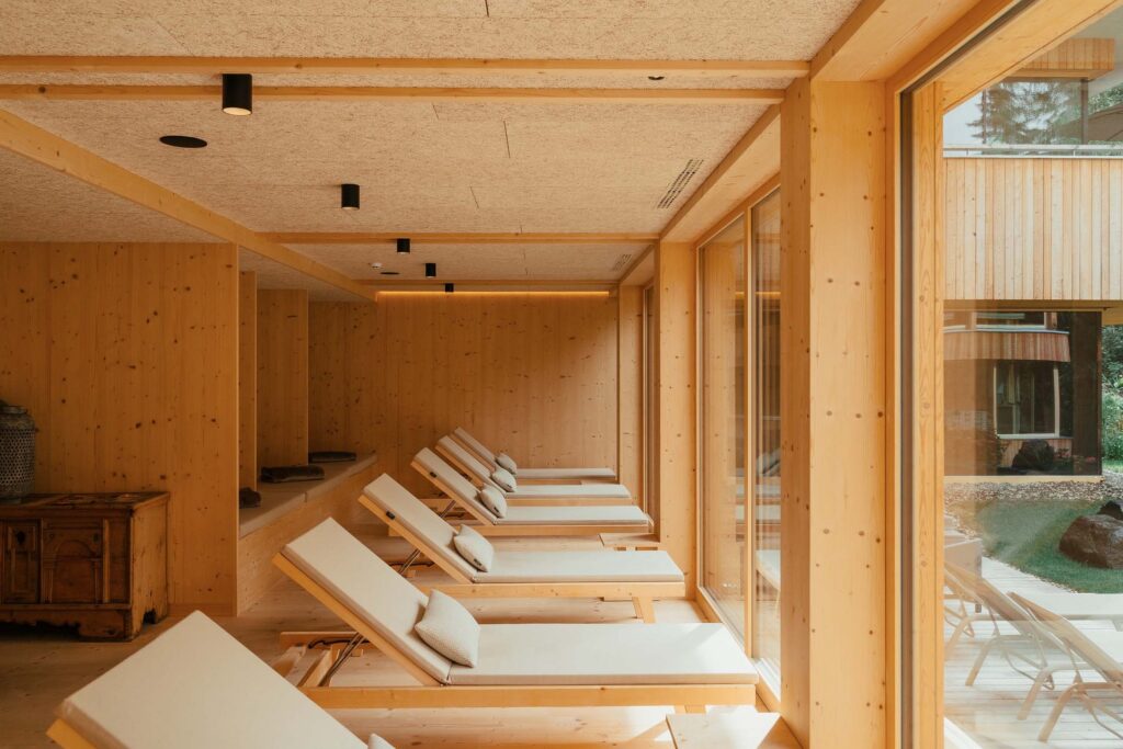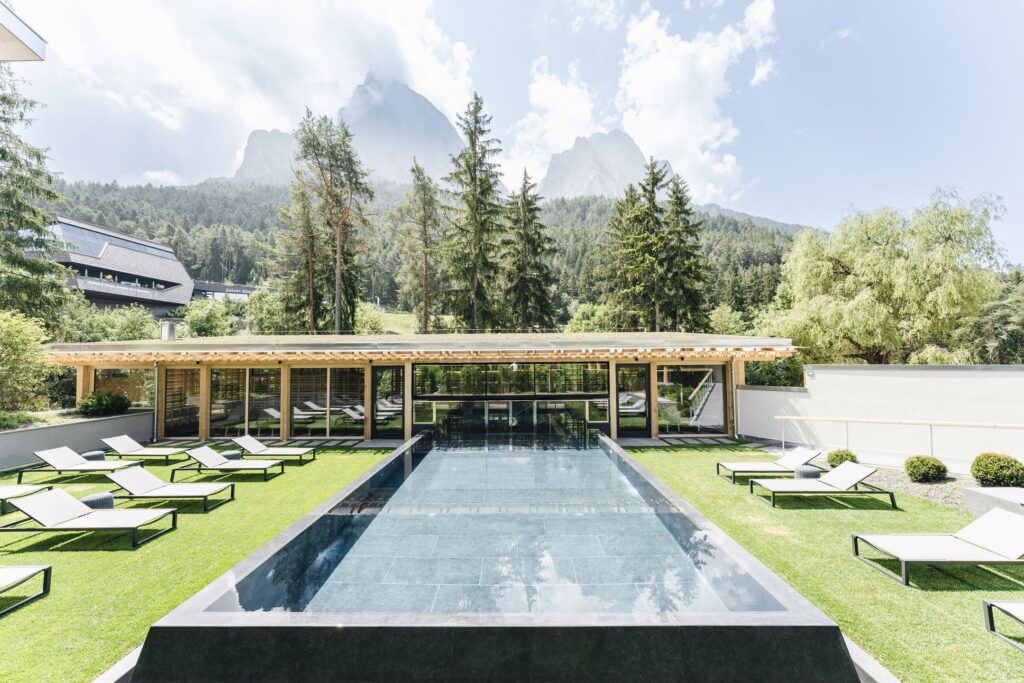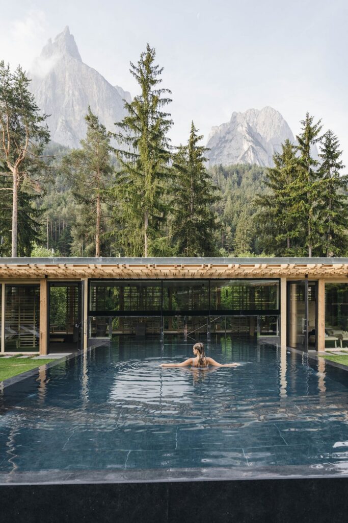 The 45 rooms and two suites (the suites come with a private Finnish sauna, free-standing bathtub and outdoor whirlpool on the terrace) are designed for guests aged 14 and over. The Bath House is the centrepiece of the spa: a timber-framed structure with heated indoor and outdoor pools at 32°C, a panoramic Finnish event sauna overlooking the Sciliar massif, a bio sauna with infrared, a steam sauna, and three relaxation zones.