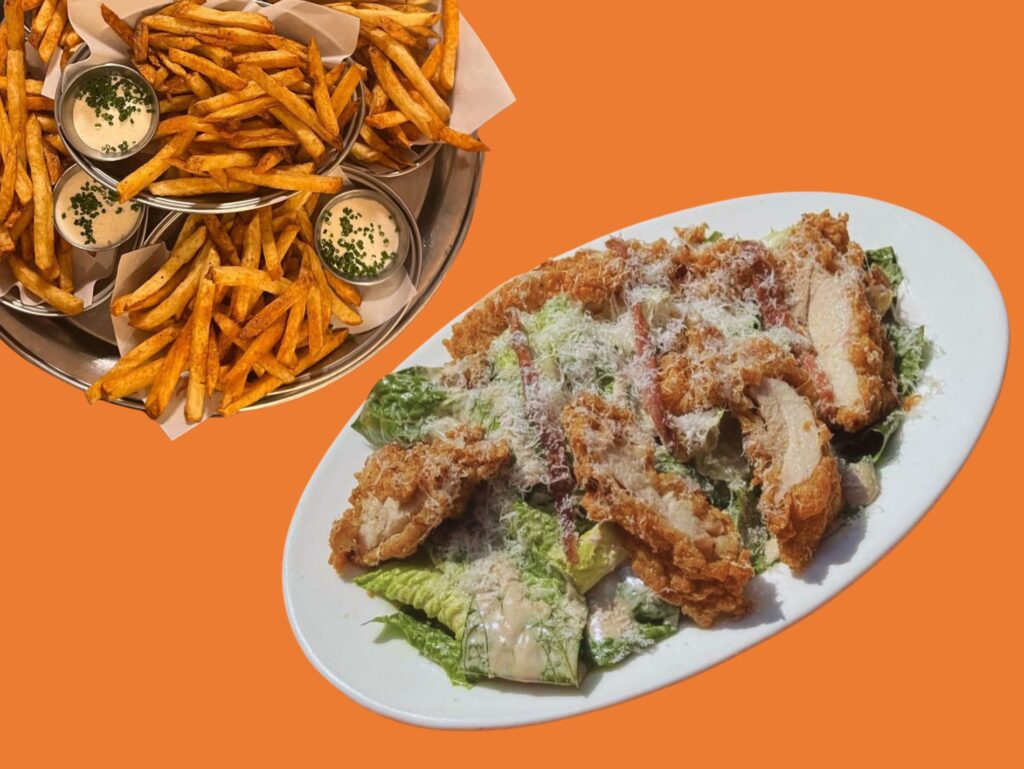 The Chicken Caesar at Rita’s is the platonic ideal of the dish, to us. Copious amounts of Cantabrian anchovies and a heap of freshly grated Parmesan, topped with buttermilk-soaked, secret-spice-dredged chicken thigh… It’s a light meal, as we said. The only drink capable of cutting through it all? Do we even need to spell it out?