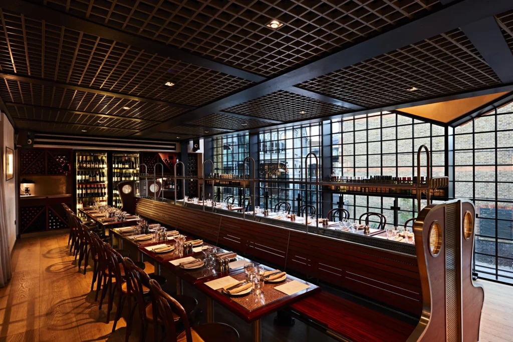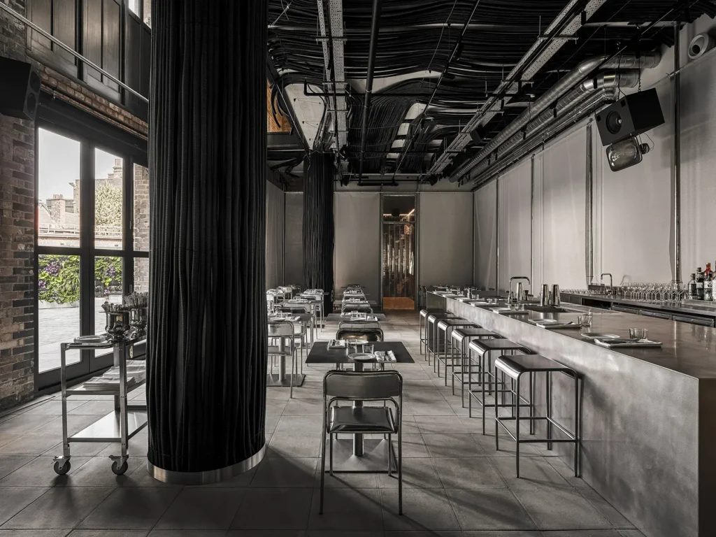 Cool and oh-so-chrome, this Shoreditch seafood spot has made the martinis part of its identity. The interior, designed by Harry Nuriev of Crosby Studios, is unapologetically futuristic: exposed high ceilings, stainless-steel surfaces, weighty pipes doubling as architectural pillars, and an intentional hyper-industrial aesthetic that feels like dining inside a glamorous construction site. It’s monochromatic, metallic, and very Shoreditch.