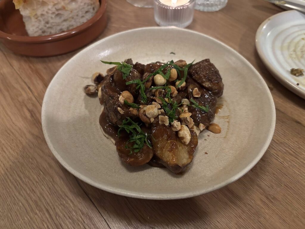Deeply roasted Jerusalem artichokes are paired with hazelnuts and a raisin and chilli dressing, the sweetness of the root offset by gentle heat. Texturally, it’s a triumph, the ‘chokes fudgy and close to collapse, the hazelnuts a toasted interlude. Celeriac pastrami – something of a Root signature across all three sites – comes with bread and butter pickles and Russian dressing, the vegetable transformed into something smoky, savoury and deeply satisfying.