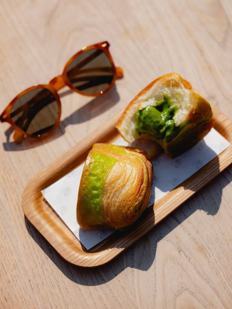 The matcha Swiss roll is the one to beat – light sponge wrapped around gently whipped matcha cream and dotted with sweet red bean, each slice restrained and assured. The matcha croissant, topped with a grassy ganache, runs it close.