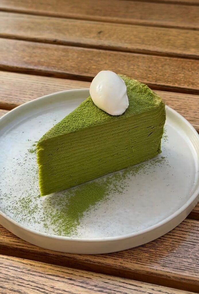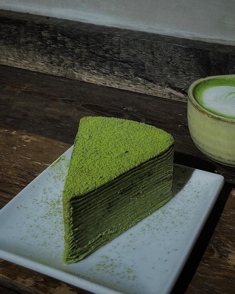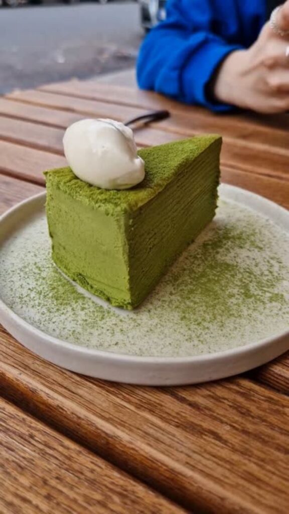 Earthy and sweet, the cake arrives as a bright and beautiful stack of delicate crepes layered with whipped cream and flavoured with savoury matcha. The colour alone is striking – that deep, almost mossy green signalling quality powder rather than the lurid hue of lesser versions. Each crepe is light and airy without losing structure, while the cream between them is restrained rather than cloying. The balance here is everything: the gentle bitterness of the matcha tempers the sweetness, and as you work through each forkful that earthy flavour develops even more.
