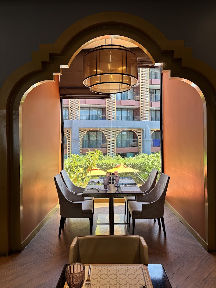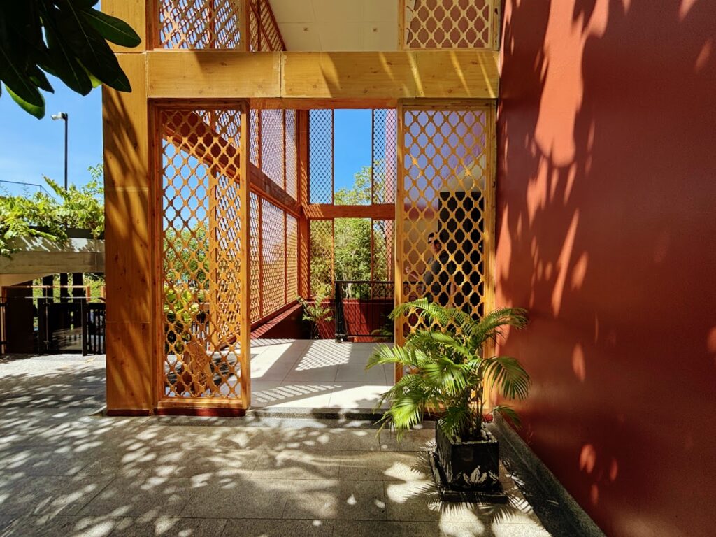 It stops you in your tracks. Five storeys of terracotta-red arched balconies run its full width, each arch framing a private balcony; the repetition gives the facade the same rhythm as the colonnaded shophouses of Phuket Old Town, scaled up to resort proportions. At its centre, a soaring golden jali screen, the latticed metalwork borrowed from Mughal and Indo-Portuguese tradition, its intricate geometric fretwork catching the light as it shifts through the day. Come late afternoon, the sun hits the terracotta and copper tones and the whole building seems to glow from within.