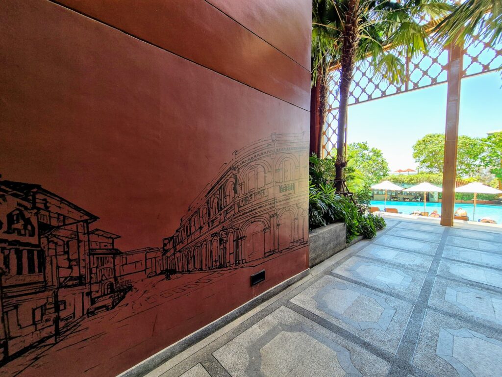 A spirit of cohesion extends into the common areas. Large murals etched into the hotel’s terracotta walls depict Phuket Old Town’s Sino-Portuguese shophouses in sweeping line-drawn detail – the clock tower, the arched colonnades, the street receding into the distance – a pointed insistence that you’re somewhere with a history. A soul. Underfoot in the corridors, encaustic cement tiles in monochrome geometric patterns echo the same heritage: the kind you find worn smooth in Phuket Old Town’s shophouses and Penang’s colonial terraces. Metal sculptures in copper and rust tones, shaped like stylised stupas, abound, in keeping with the hotel’s layered references to Southeast Asian design sensibility.