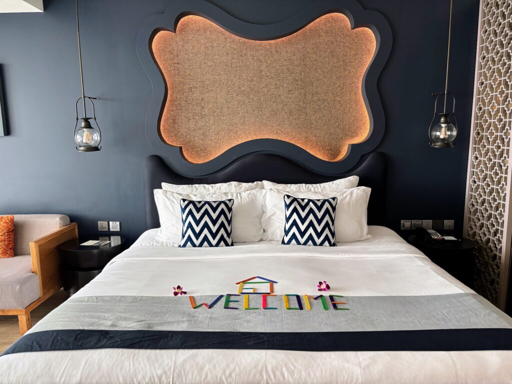We arrived to a platter of cakes – the Phuket pineapple cake our favourite, closely followed by the pandan – alongside a welcome message drawn on the bed with coloured lollipop sticks. Small touches, but they land.