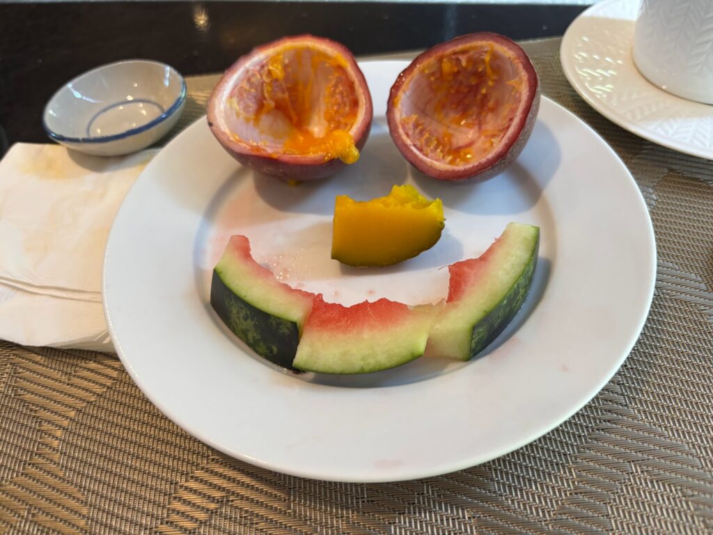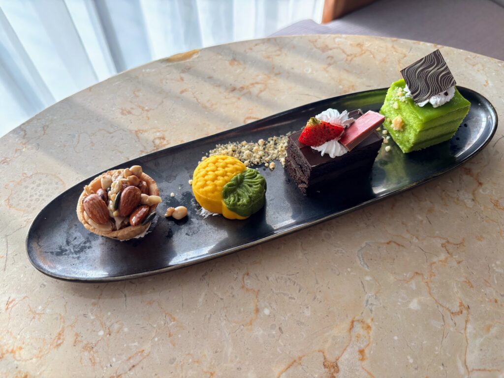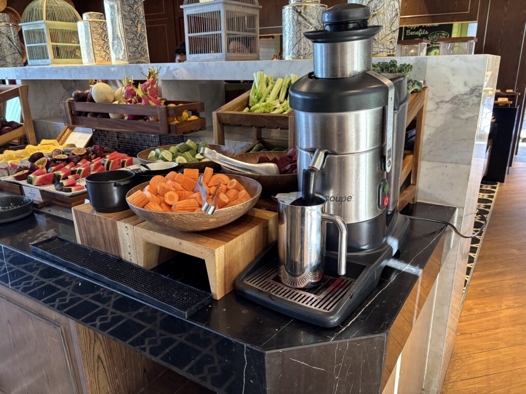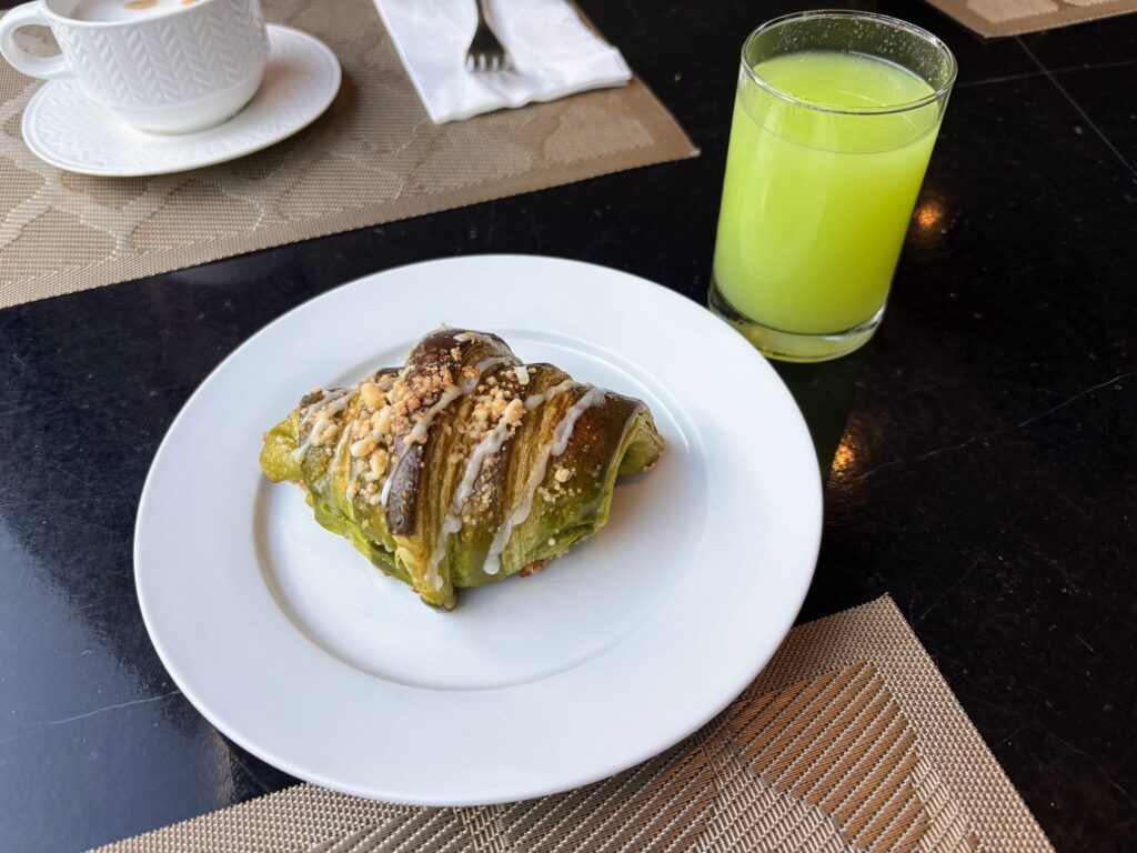 A daily-changing pastry special meant a purple sweet potato croissant one morning, followed by a matcha and tarte tatin-adjacent one involving caramel and apple. Both were wonderful; burnished and freshly baked, a rarity in hotel buffet breakfasts in the Kingdom.