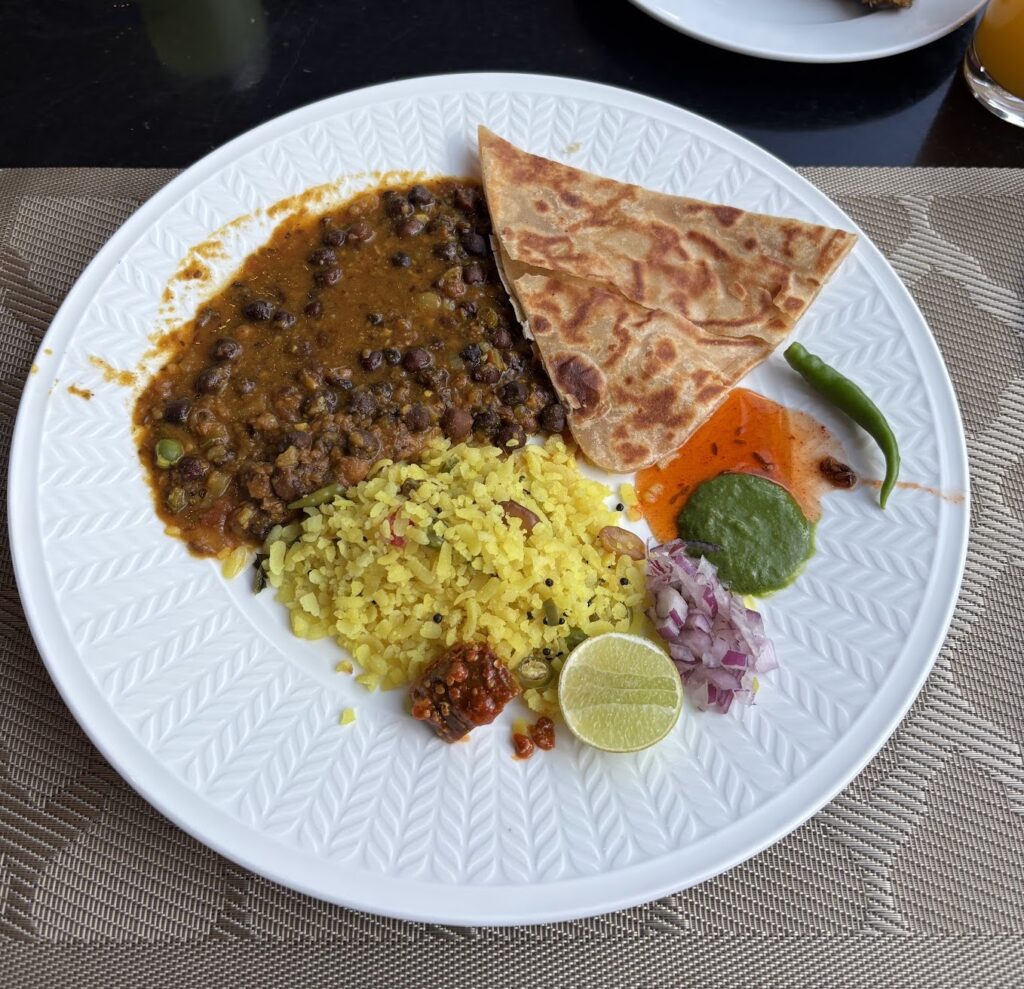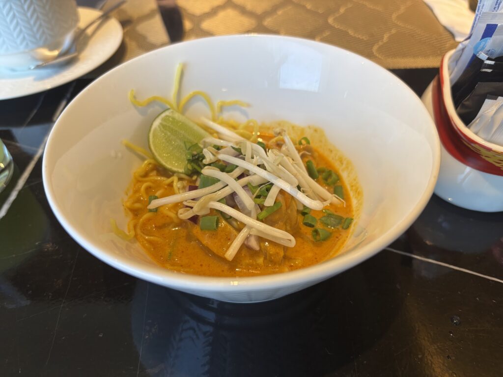 In one corner, an expansive hot section offers Indian and Thai breakfast dishes on a rotating cast: fried rice, pad see ew, and a daily-changing Thai speciality. On one of the days we stayed it was khao soi – so good we wondered aloud whether the chef was from Chiang Mai. He’s not.