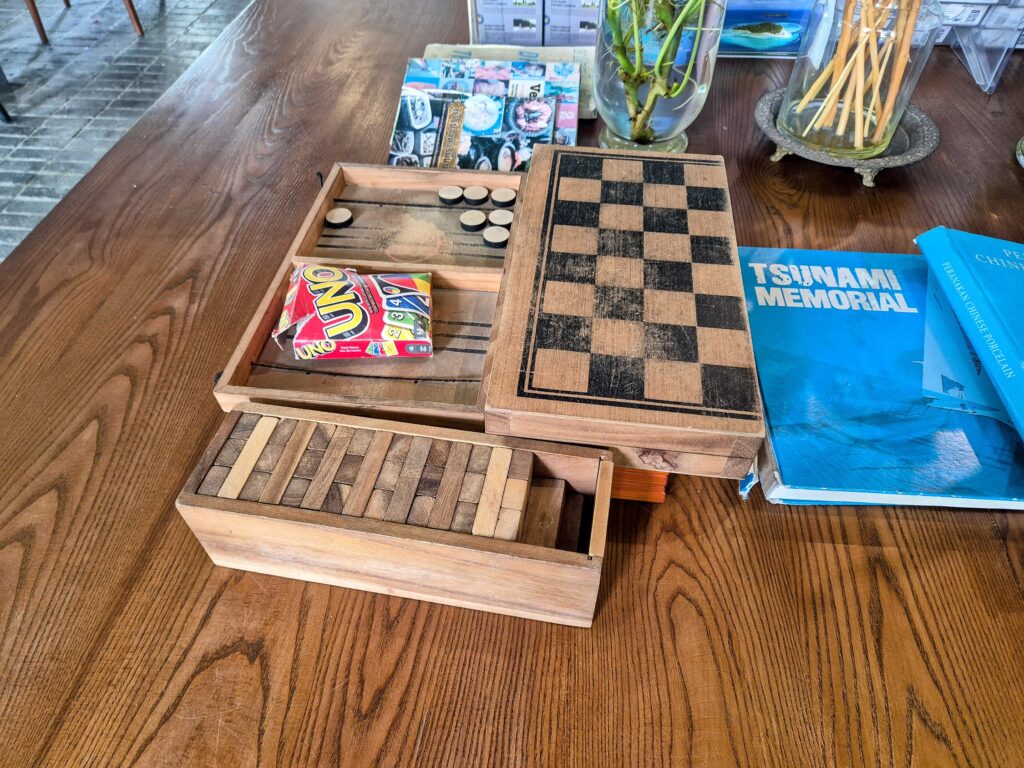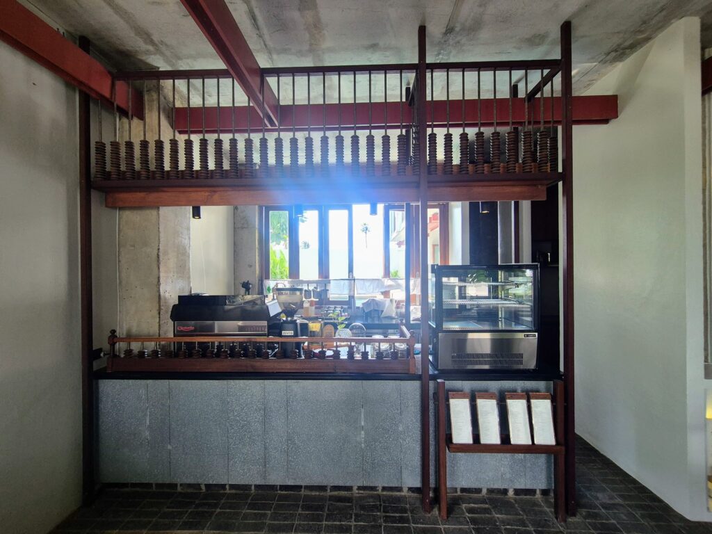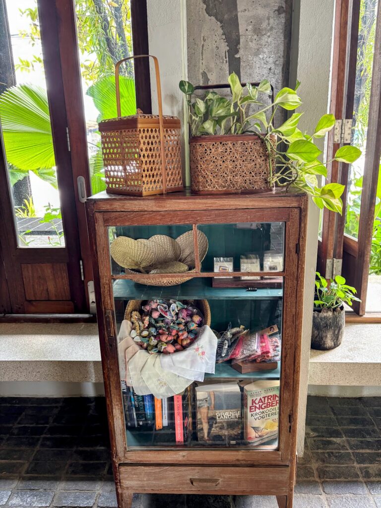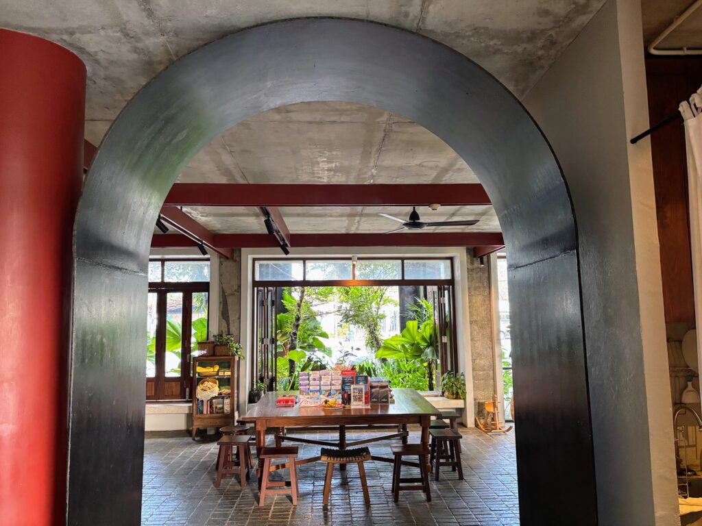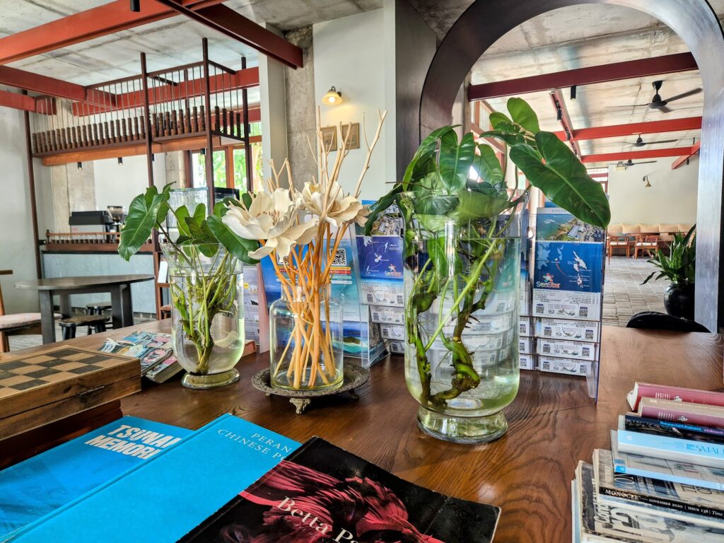 Checking in feels more like being welcomed into a family home than anything transactional. The ground floor – reception, café, and restaurant – is arranged around a large central table with antique-styled stools and benches, the kind of multi-purpose communal surface that was a fixture of extended Chinese family life in this part of the world. On it, a tsunami memorial book and an encyclopedia of Siamese fighting fish.