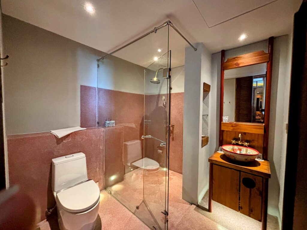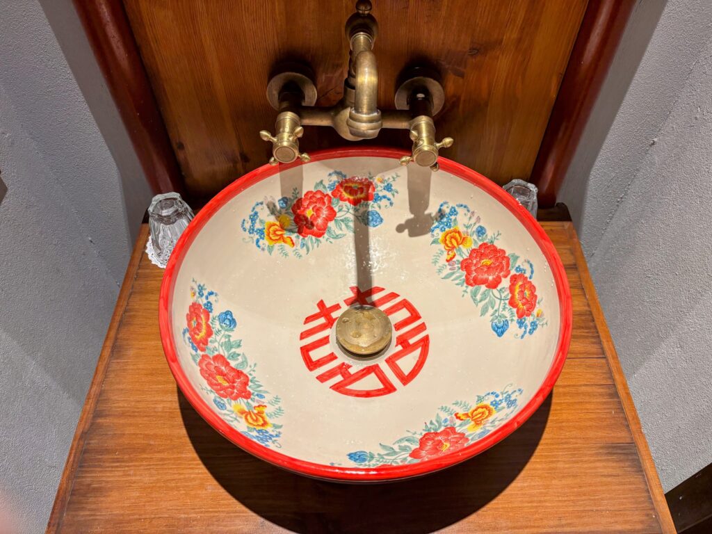 Fuck it.The whole room is graceful. The wash basin alone is worth a moment’s pause long after you’ve deposited your mouthwash down the plug: a wide, shallow ceramic bowl hand-painted with red peonies, blue florals, and a Chinese double happiness symbol at its centre fed by wall-mounted brass taps. It makes you resent your boring white bathroom sink at home. Even the shampoo and shower gel arrive in hand-painted ceramic dispensers, floral-patterned in the Peranakan tradition, with brass pump fittings.