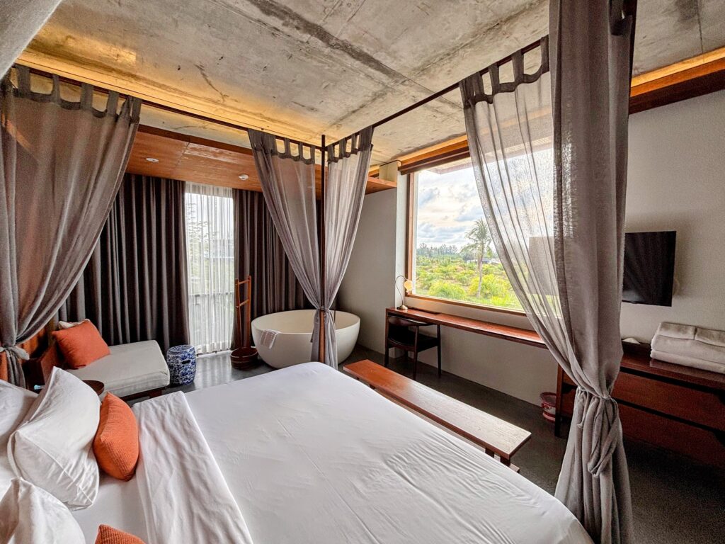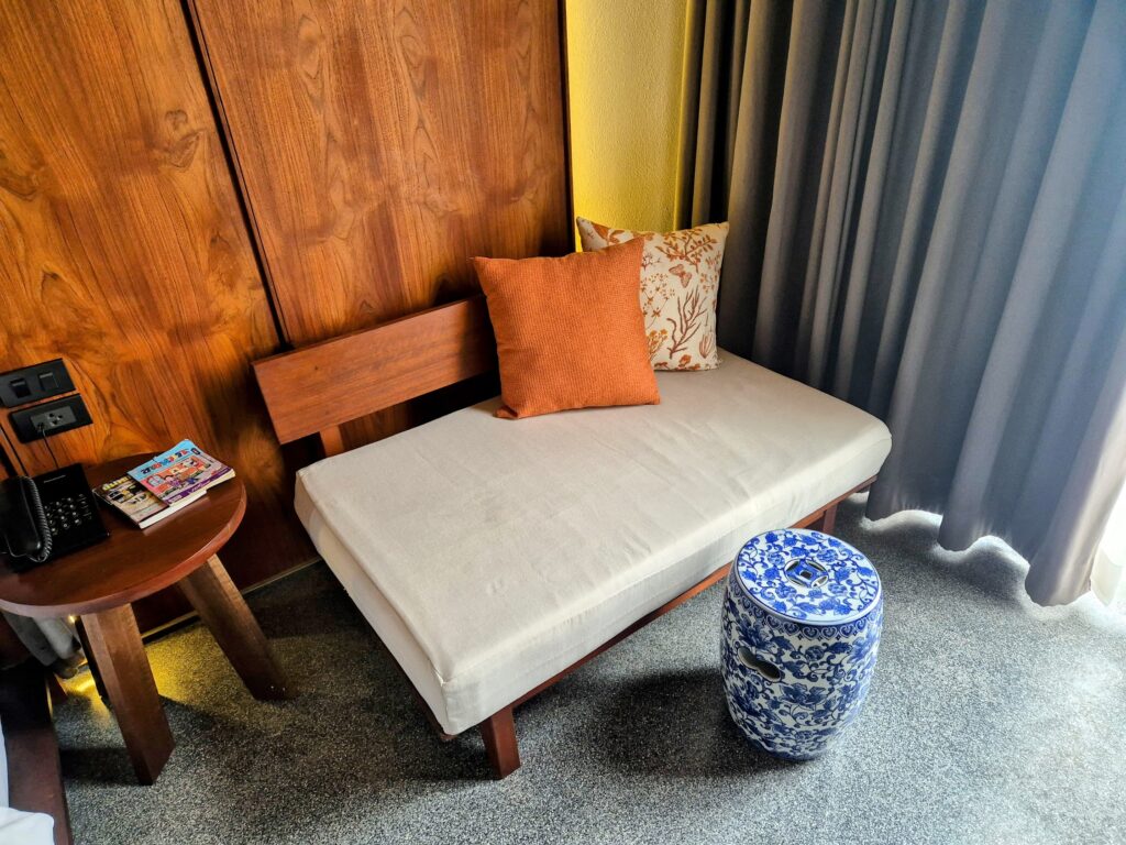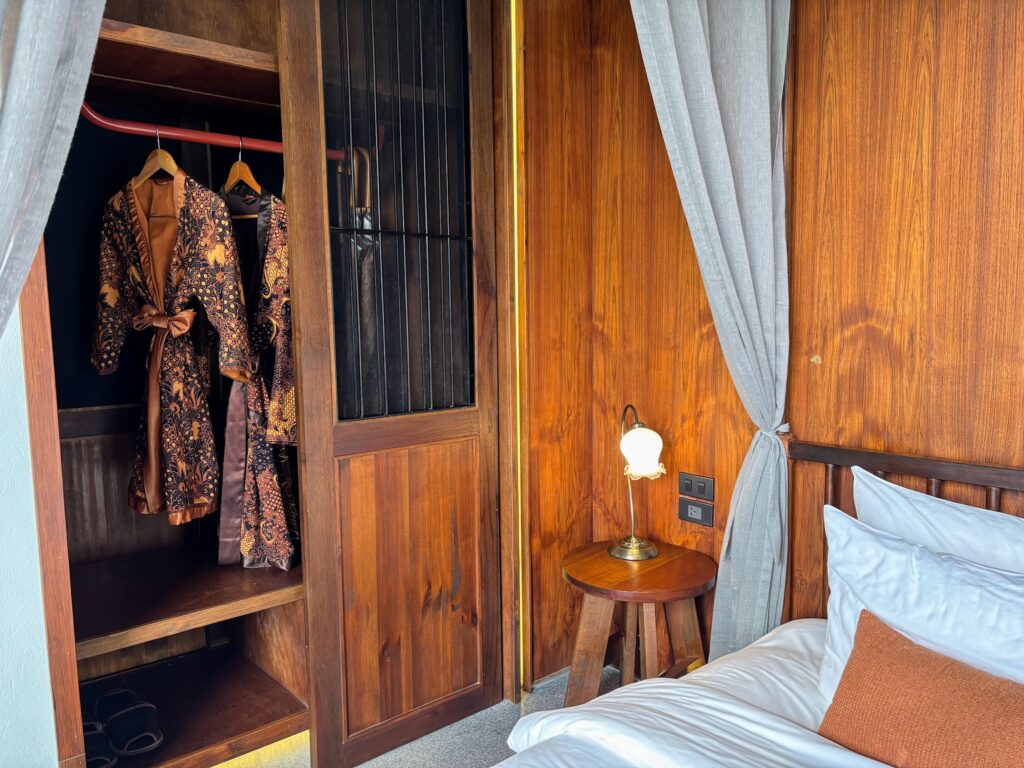 With only 20 rooms, Hotel Gahn is genuinely familial, and the rooms themselves are built around a warm, considered aesthetic – dark teak, warm concrete, and Peranakan references threaded throughout.