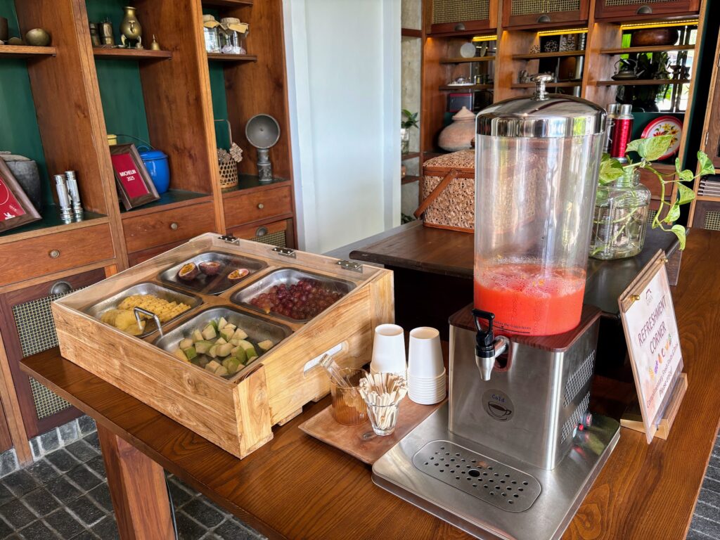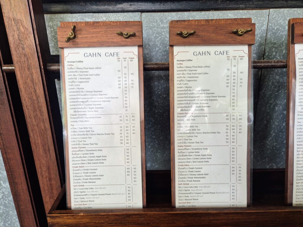 The Gahn Café, on the ground floor, is worth factoring into your day if you need a pitstop. It’s a relaxed place for tea or coffee, with handmade bakery items and local Thai desserts alongside. You might find yourself sitting longer than planned, which fits the hotel’s unhurried character well. The drinks menu is extensive: Thai teas (the Honey Thai Tea is worth ordering), fresh watermelon and coconut juice, and traditional Thai coffee. Don’t miss the orange or coconut flower espresso, and their signature house cocoa is good, too.