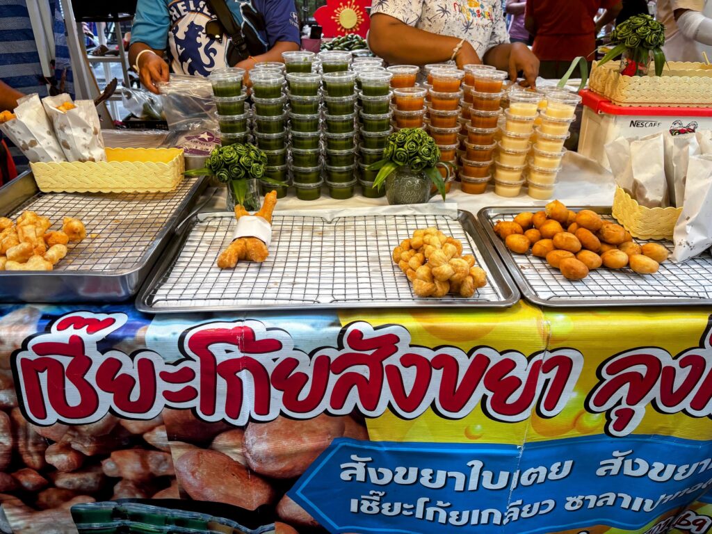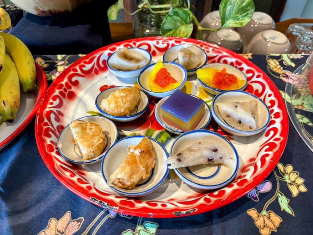 Breakfast leans Thai, and rightly so. Pa Tong Go – the deep-fried dough sticks famous on this part of the coast – sit on the buffet table alongside a pot of condensed milk for drizzling. There’s crispy cai poh tofu with sweet noodles, a generous spread of khanom wan (Thai sweets), and congee that earns its place on a slow morning.