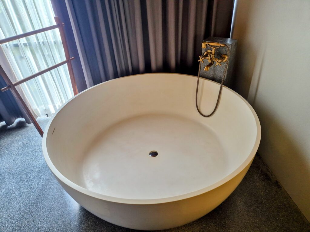 We stayed in a Grand Deluxe room, and the centrepiece is magnificent: a vast circular freestanding soaking tub in matte stone composite with a heavy, ornate brass tap. There’s this weird urge to get in it, lay down and contour your body to the curve, even if you don’t run a single drop of water. It’s that big and that inviting. I considered sleeping in it for a laugh. You can even swivel the TV to face the tub. Sure, you’ll be watching France 24 on half hour cycles, but the subversiveness of the whole affair is pretty fun for a while.