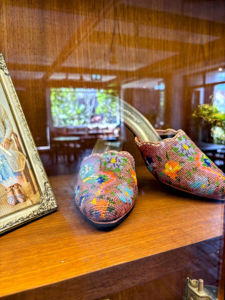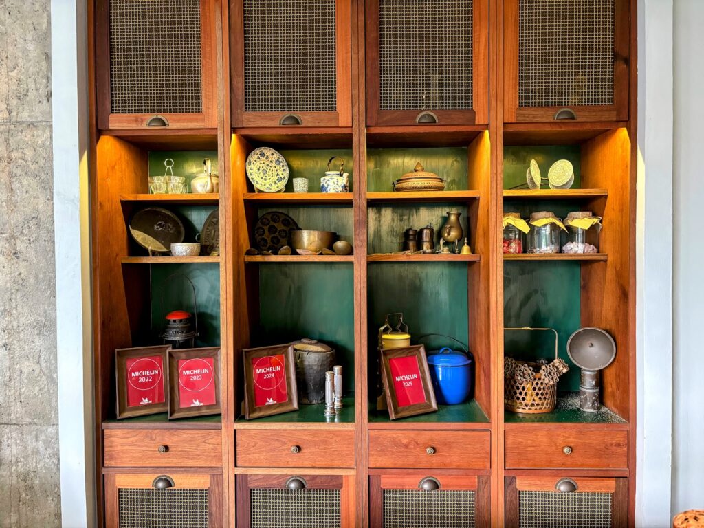 It could pass for a small museum. Intricate Peranakan porcelain lines the shelves, timber chairs are cushioned in batik cloth, and tall glass cabinets display the owner’s mother’s vintage collectibles: old irons, an abacus, an exquisite pair of beaded shoes with the photograph of the woman who wore them placed alongside. Along the restaurant walls, traditional cooking equipment and crockery do a kind of work that the kitchen beyond continues. In the corridors, framed stories about local superstitions offer advice on the correct direction to sleep in to avoid ghosts. It feels like a family home that happens to have rooms available, which is more or less exactly what it is.