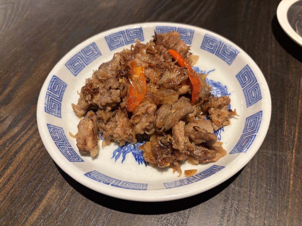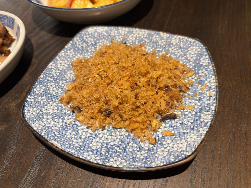 The moo phad koei kem arrived next, pork stir-fried with pickled garlic – deceptively simple, deeply aromatic. Then pla kem foi, fried salted krill served with sweet fish sauce: a dish with tension, a dish designed to be eaten with plain steamed rice that is of course cooked with the ultimate care.