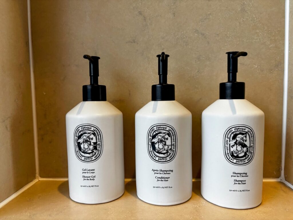 Back inside, and the bathroom is stunning, with the curling, come hither bamboo motif not letting up. Amenities go well beyond the usual vanity kit: Dyson Supersonic hairdryers, complimentary, bottomless Acqua Panna mineral water, and Marvis, the crème de la crème of toothpaste. There’s also a lemongrass and geranium shampoo and conditioner from Diptyque, which leaves your hair feeling so soft you start to understand why celebrities always look the way they do. That, and botox.