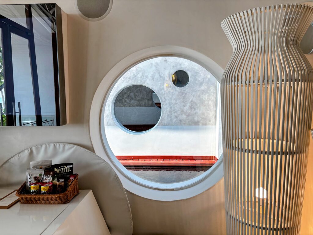After a night on the circular mattress, held in the embrace of bamboo, we wondered why all beds aren’t this shape. The coffee table, though, was the piece we kept returning to: a low, white mosaic form with undulating, lobed edges, almost topographic, almost coastal. Whether or not it was the intention, it read to us like a map of Phang Nga Bay rendered in miniature. It is a room whose references only deepen the longer you spend in it.