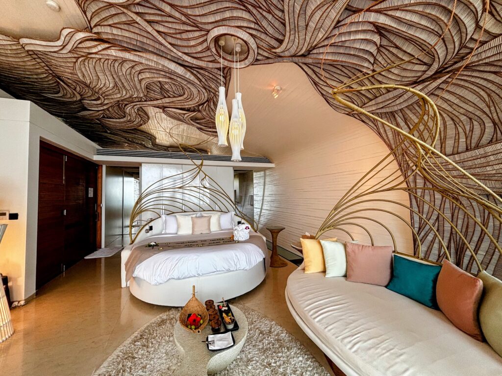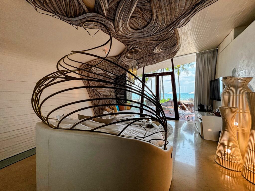 Wongcharit conceived the suite’s furniture as both form and ritual object: the bed and sofa are woven from bamboo in shapes that reference the silkworm cocoon and the temple stupa simultaneously, and hang from the ceiling rather than resting on the floor. The ornate detailing that covers the walls and ceiling is the work of a different hand: Thai artist Korakot, whose dense, swirling bamboo installation envelops the entire room, lending it the quality of being held inside something organic.