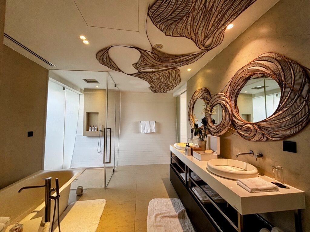We stayed in the Siam suite, designed by Thai designer Eggarat Wongcharit, who also turned his eye to the adjoining Golden Temple Bell Spa. He is the only Thai designer among the eleven international names commissioned at Iniala, and has spent his career arguing that traditional Thai craft is not folk heritage to be preserved behind glass but a live design vocabulary capable of speaking on any international stage. The suite is where that argument is made most forcefully.