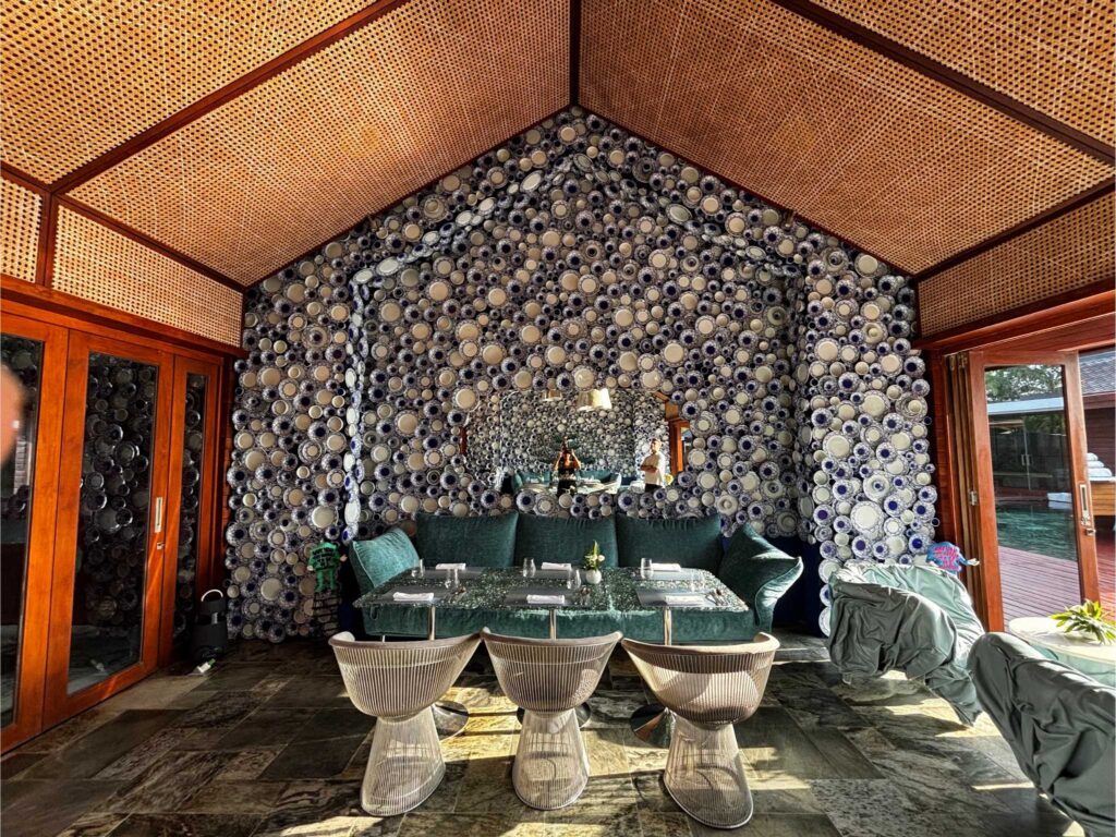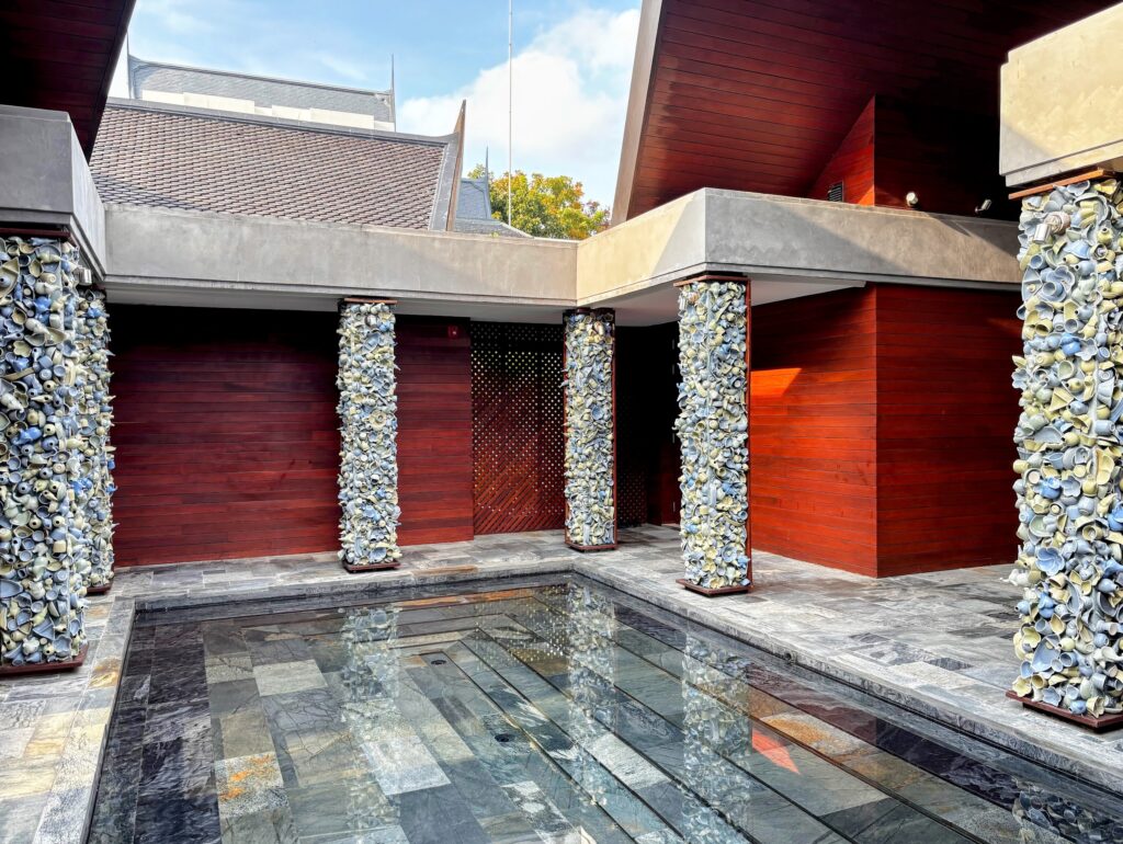 Out in the entrance courtyard, ceramic columns rise from a reflecting pool, each encrusted with hundreds of glazed pieces in soft celadon and dusty blue, clinging to the surface like barnacles on a sea-pier. They took the Campanas around 600 hours to make, and hidden among the clustered forms are elephants, flowers, miniature teapots and other small surprises rewarding a closer look. It’s where Iniala’s twin pillars of art and culture quite literally intertwine.