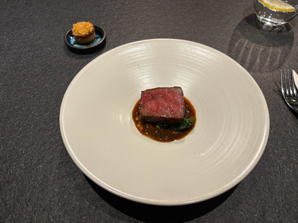 At the chef’s table, a Phang Nga squid with smoked tomato and Rayong wasabi opened beautifully, and the day boat coral trout with toasted koji butter and burnt purple eggplant was a standout. The ‘main’ course was 76-day aged wagyu striploin, arriving alongside a toasted crumpet with bone marrow and a massaman-inspired curry sauce, a pairing that sounded experimental on paper but landed with absolute conviction.