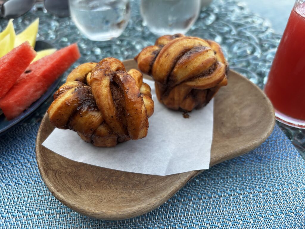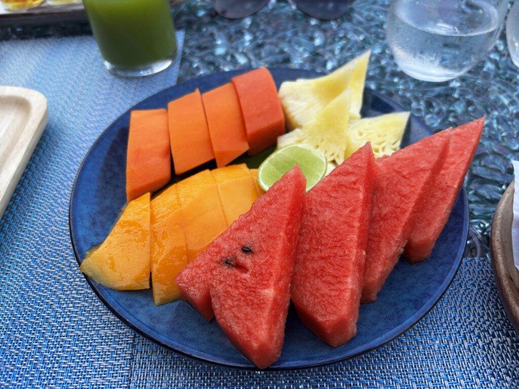 On the bed, your name has been spelled out in fresh flower petals and orchids, alongside neatly folded towel origami. A welcome platter is ready and waiting: an assortment of local dried fruits (pineapple, mango, nuts) alongside cheeses, local honey, sweets and cookies. After a long journey, it lands well. The macarons were, admittedly, a little lurid, but we were told the chef is working on a tamarind and ginger pastille replacement, which sounds considerably more promising.