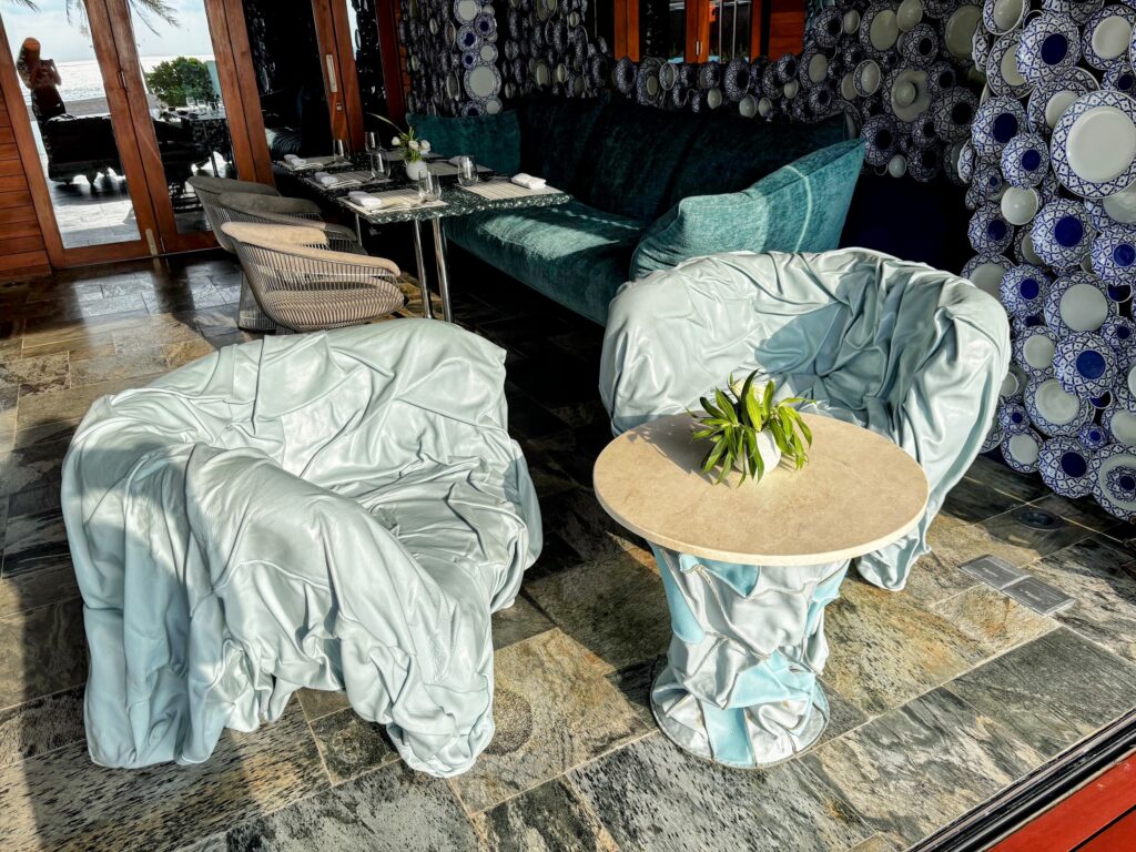 The Campana Lounge (designed by the late Fernando Campana and his brother Humberto, the celebrated Brazilian designers) is the heart of the communal areas. The most striking detail is the wall: hundreds of classic Thai blue-and-white ceramics – plates, bowls, pedestal dishes – clustered across the surface in cresting, wave-like swells. A nod to Bangkok’s Wat Arun and its broken-porcelain mosaics, here it’s translated into something looser and more oceanic. In other hands it could tip into the gaudy, and those denim-shrouded chairs won’t be to every taste, but boy is it fun.
