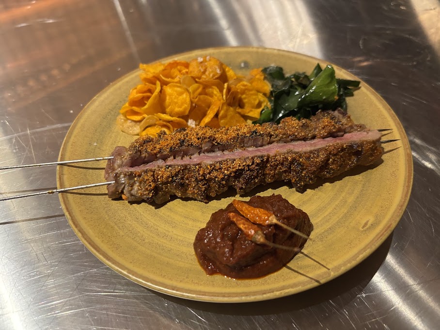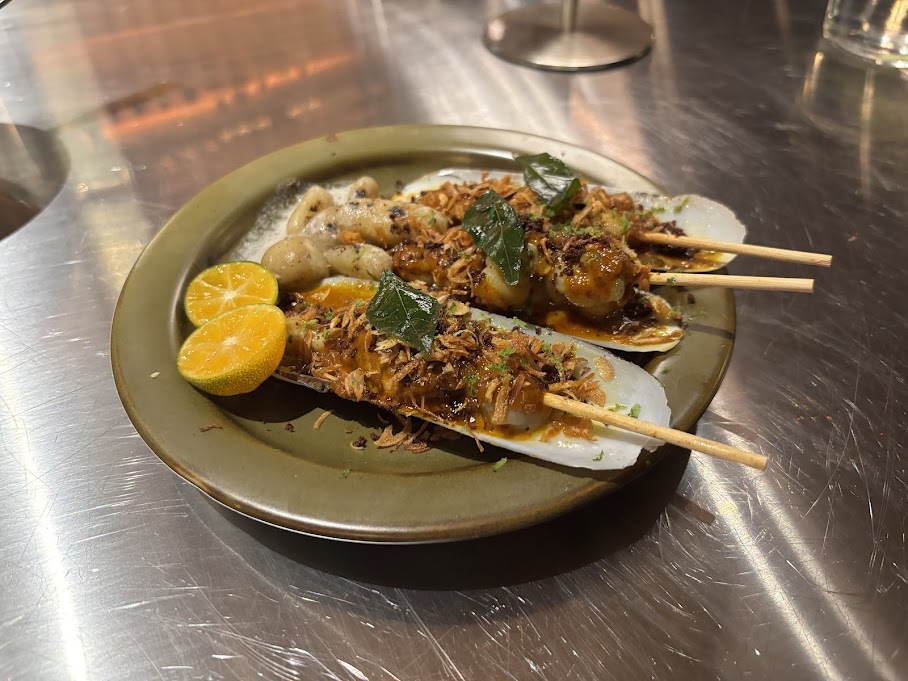 From our visit, the grilled bamboo clams with Southern golae sauce were a highlight: sweet, smoky and slicked with a tart coconut marinade that had caught on the grill and caramelised into something that tasted vaguely obscene. Trang venison skewers with toasted spices were terrific too, the dry spice rub assertively bitter, the meat blushing, its companion relish fruity, glossy, and really fucking spicy.