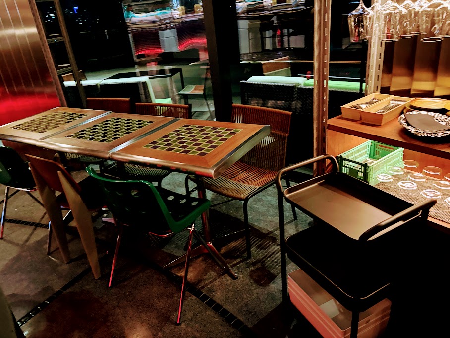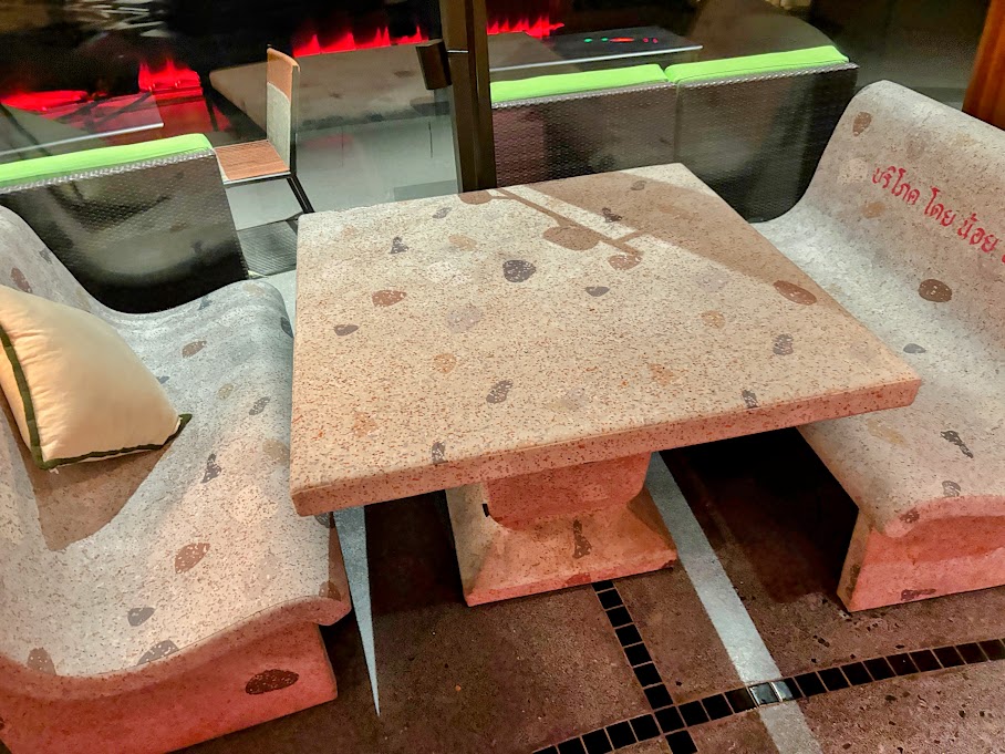Despite its address, you don’t feel like you’re eating in a shopping centre at all. The interior has a wry, knowing quality: chequered tables frequently found in public spaces for playing Makruk (Thai chess), foam replicas of classic terrazzo-style concrete table and bench sets that you see dotted around every public space in Bangkok.