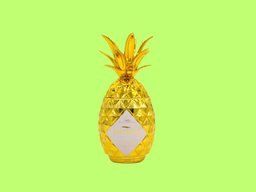 A golden pineapple-shaped bottle containing French VSOP cognac, Dutch vodka, and tropical fruit. The design is so committed to the pineapple concept that the leafy crown unscrews and reattaches to the bottom, turning the opened bottle into a display piece. Founded by a burnt-out pharmacist who had a life-changing cocktail served in a carved pineapple while on holiday in St Barths, Piñaq has built an entire brand around tropical escapism.