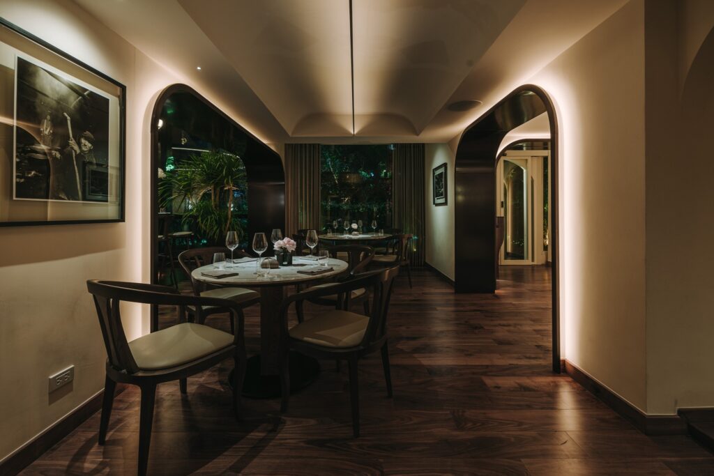 INDDEE occupies the building that once housed the original Gaggan, a fact that adds weight to arriving here. The century-old house off Langsuan Road has been reworked across two floors in eggshell tones with marble, antique copper and Indian walnut wood. Two open kitchens at ground level divide into hot and cold sections, opening onto glasshouse dining rooms where the brigade works in full view.
