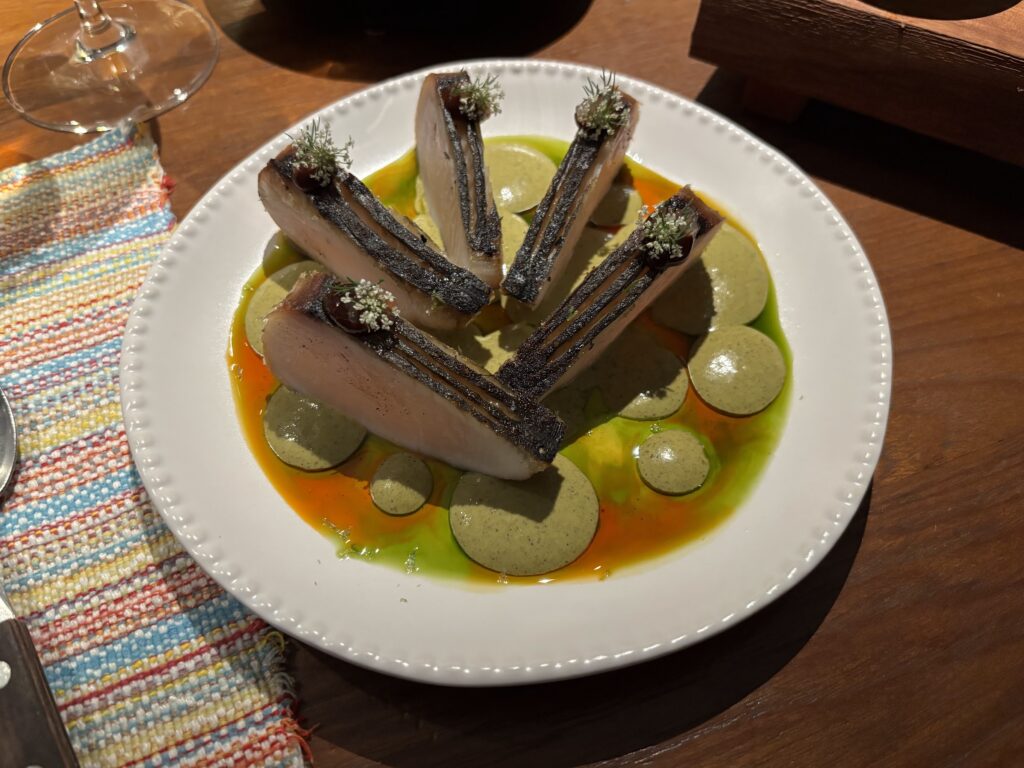 Later, a carabinero finished tableside represents Goa: a Recheado glaze built on chilli, aromatic spices and vinegar meets a coconut gribiche lifted with tamarind and jackfruit, two recipes from the same coast defined by different souring agents. The prawn is smoked over charcoal and finished in the marinade, and an ambotik – a sour, spicy Goan curry – arrives in a glass to frame the sequence. You move between the three elements in a prescribed order, and the interplay between fruit acidity and vinegar shifts with each pass. We’re loath to call it educational; that would do a disservice to how fun it is to dine here, but we certainly left having felt we’d learnt something.