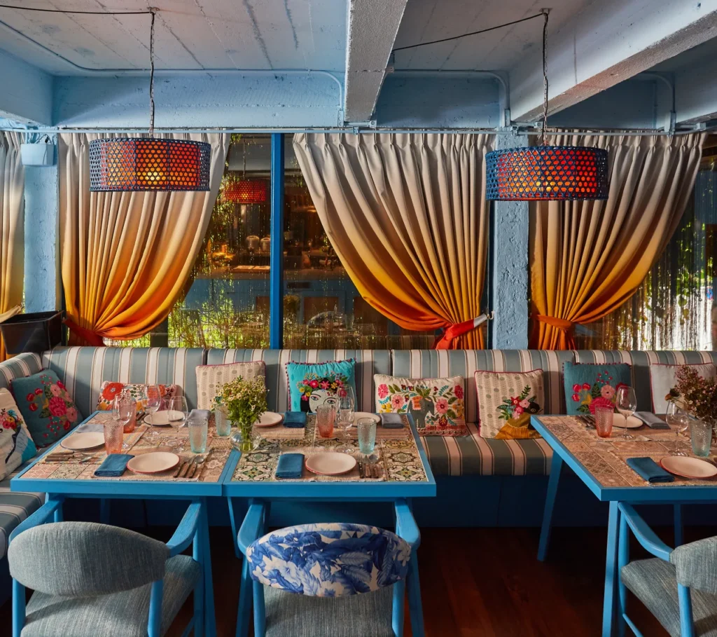 Gaggan Anand’s casual restaurant sits on the second floor directly above his main venue on Soi 31, built around a fictional love story between an Indian man and a Mexican woman. The room is painted in vivid oranges and blues, the music is loud, and the whole thing feels more like a lively supper club than a sit-down meal. You can eat at the central horseshoe bar overlooking the open kitchen if you want to watch the two head chefs, Hernán Crispín Villalva and Roshan Kumar, work the line.