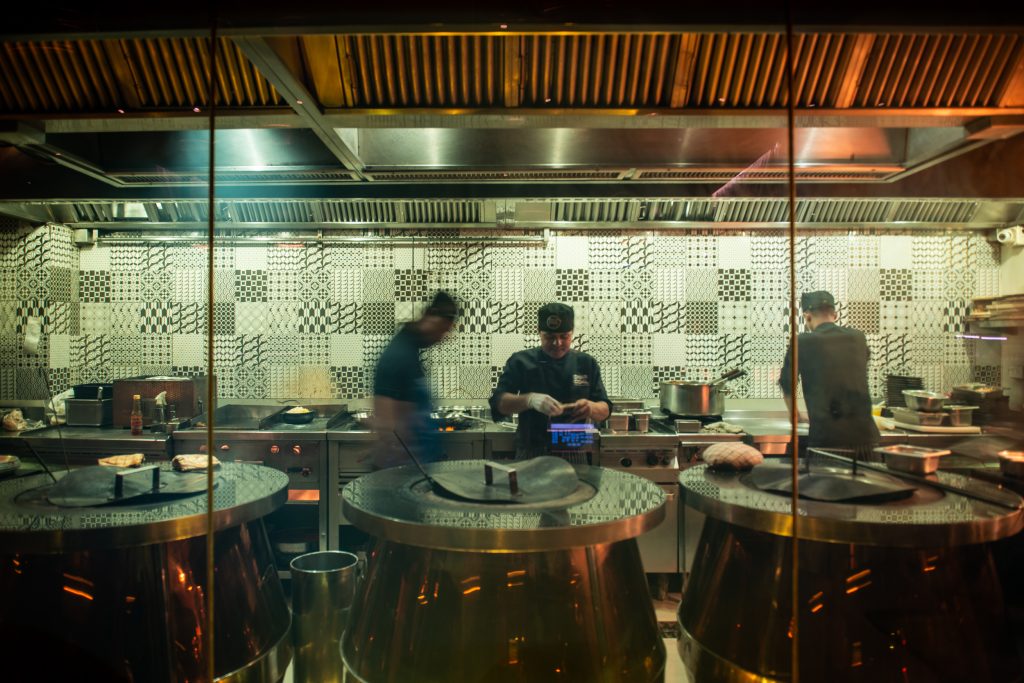 The lighting is low enough that you may wish you’d brought a torch, but that fits: copper-clad clay ovens glow behind glass in the open kitchen, a spice library lines one wall, artwork nods to Mumbai’s tiffin dubbawallahs, and colonial punkah ceiling fans turn overhead. The smell of coals and charring meat fills the room. It is more theatre than most Indian restaurants in Bangkok attempt, but here it works.
