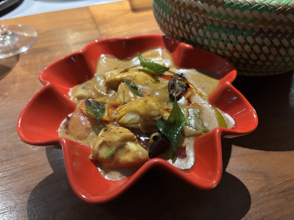 The Kundapura ghee roast, cooked with masala from the Konkan coast, has become a signature, available with chicken on the a la carte and with crab on the tasting menu – the latter stuffed into a crab shell, topped with idli batter and steamed, a clever inversion of the more familiar neer dosa pairing. A Coorgi pandhi curry brings slow-cooked pork belly with kanchampuli vinegar and soft pathri rice breads, served with a gotukola salad made from leaves known in Thailand as bai bua bok, a small crossover that feels entirely at home here.