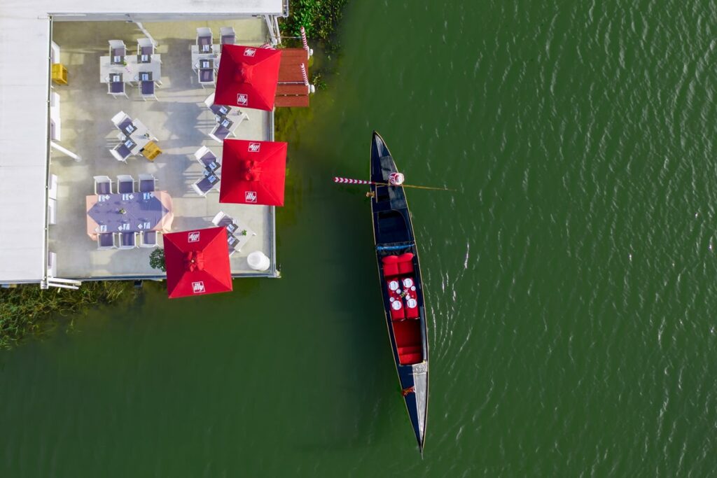 The opulent, overblown setting plays its part in a big way. Bocconcino sits right on the lagoon at Boat Avenue, its terrace extending over the water, and at sunset it’s a genuinely striking spot, made all the more surreal by the restaurant’s own gondola, moored at a small pier and available for private dining, gondolier in striped shirt included.