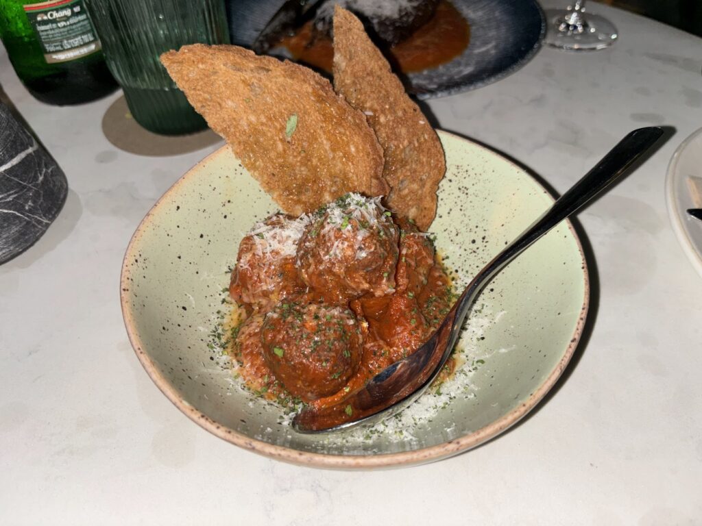 Speaking of clinking glasses, the drinks list has enough personality to match the foods big, bold flavours. Wines by the glass start at 350 baht for a Calmaggiore Prosecco or a Sicilian Nero d’Avola from Regaleali, with a compact but well-chosen selection that leans Italian and New Zealand across both colours. If cocktails are more your speed, the numbered signature list is worth exploring – the No. 7, a bourbon sour with Cinzano dry vermouth and ricotta cream cheese foam, is the kind of thing that sounds like it shouldn’t work but absolutely does.