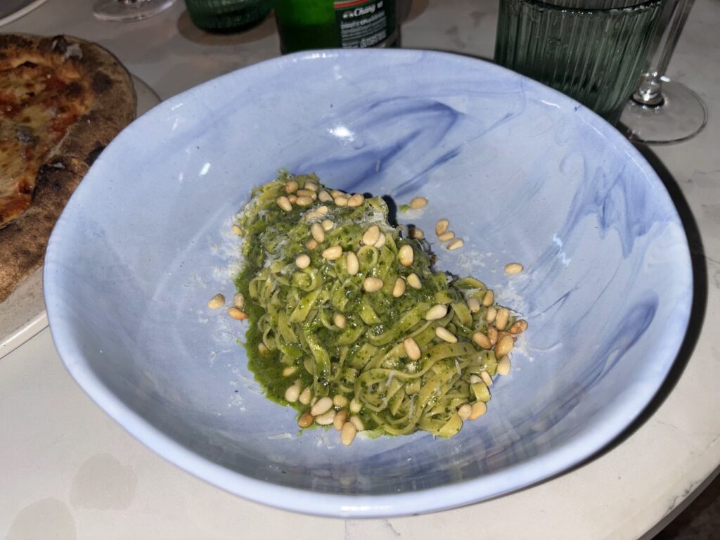 A pesto pasta was vibrant and just the right level of loose, topped with a generosity of pine nuts that would bankrupt a restaurant back home, while the aubergine parmigiana was a properly layered job, its enthusiastic caramelisation showing a chef cooking with instinct rather than from a hotel playbook.