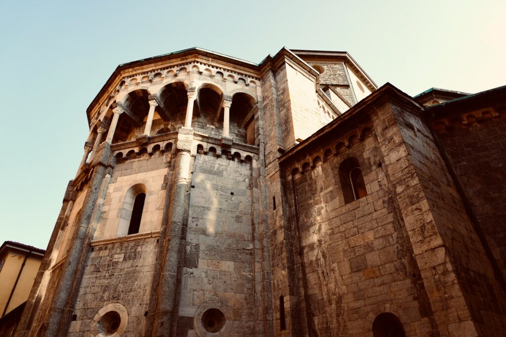 Near the top, you’ll find the Basilica di San Giacomo, a 12th-century Romanesque church with original frescoes still visible on the interior walls. The climb takes about 15 minutes at a steady pace, considerably longer if you stop for photos or to catch your breath – and you will want to stop, both for the views and because the incline is genuinely challenging.