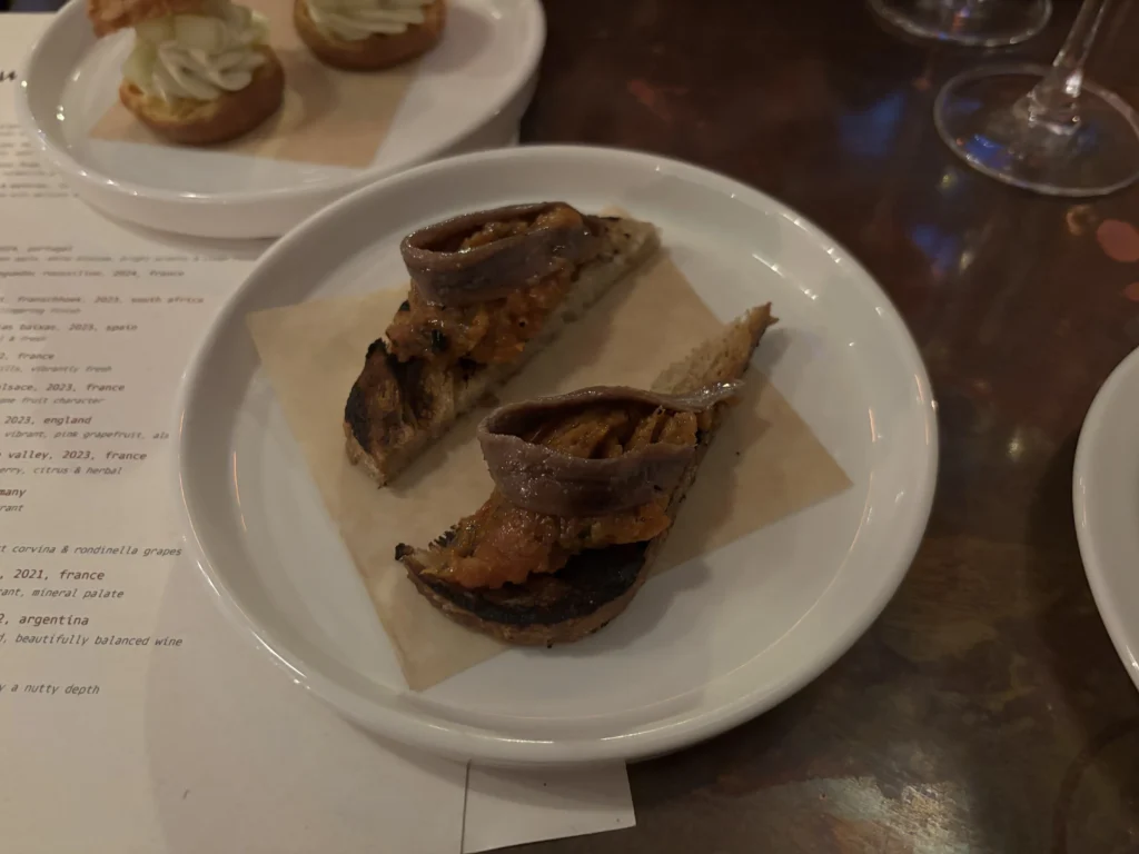 The raw bream offers a delicate interlude, with miso lending umami depth and sea buckthorn providing that characteristic sharp, citrusy lift. It’s pretty, and the fish arrives pleasingly thick cut and clearly handled with care. Then comes the anchovy and tomato concasse on grilled bread, which sounds almost pedestrian until it arrives and you realise this is pan con tomate’s more sophisticated older sibling. The anchovies are high-grade Cantabrian, the tomatoes sweet and concentrated, the bread properly charred with the kind of smoky backbone of a slice that’s been left in the toaster for a little too long.