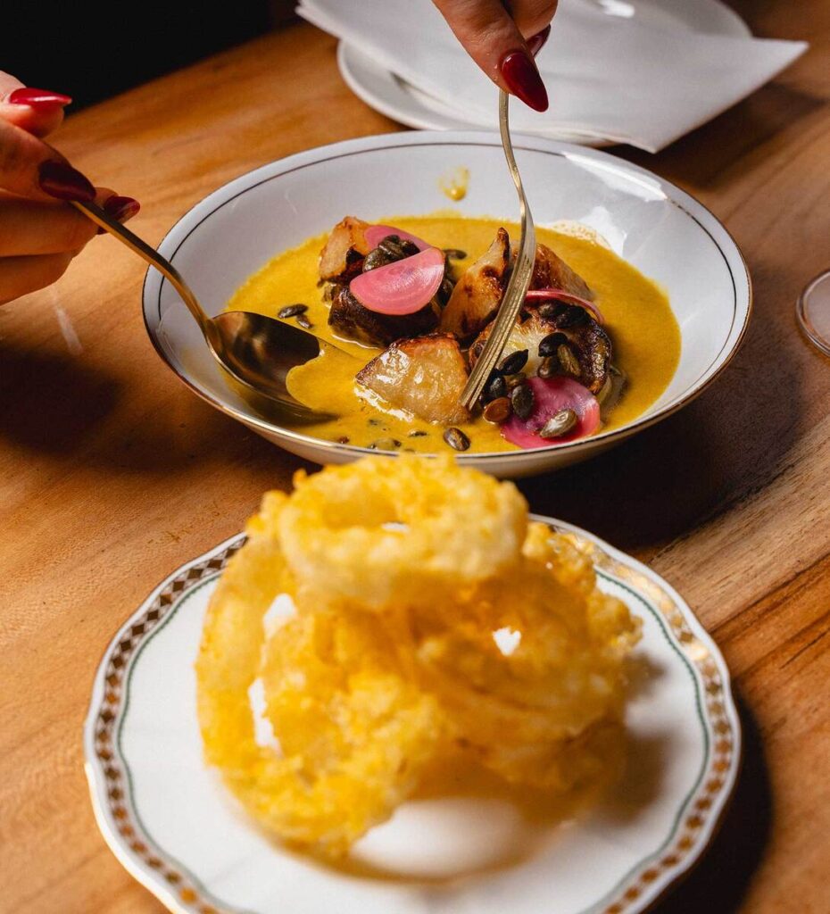 The menu is concise but expertly crafted, with sharing plates ranging from £9 to £16. Raw bass with calamansi nam jim, salt-aged beef nam tok salad with bone marrow aioli, and a papaya salad so spicy your ears start ringing are standouts. The battered pickled onion rings with curry salt have already achieved near-legendary status, whilst the grilled corn-fed chicken skewers with milk caramel sauce show real creativity within traditional Thai frameworks.